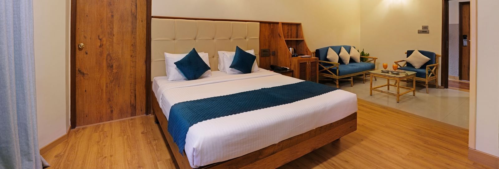 For those seeking spacious hotel rooms in Bengaluru, our Executive Rooms are your ideal choice. Spanning 405 sq. ft., these rooms offer the option of a queen size or twin beds and can accommodate up to five guests. For added convenience, each room includes a separate living area, perfect for work or leisure activities. Additionally, the rooms are equipped with modern amenities such as complimentary Wi-Fi, air-conditioning, a mini fridge, and services like laundry, ensuring a seamless and comfortable stay.